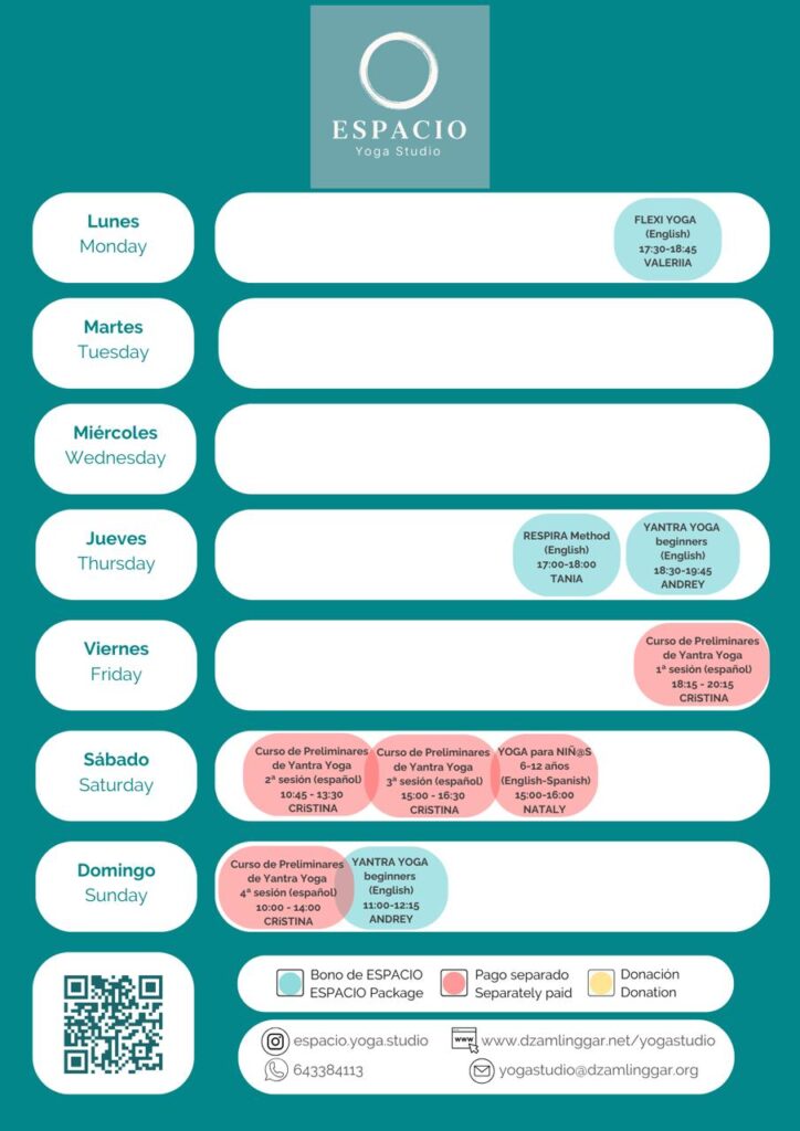 Achieve well-being at ESPACIO Yoga Studio. We are dedicated to the study and practice of Yantra Yoga (Tibetan Yoga), breathing, dance, and meditation to nourish body, energy, and mind. Enjoy varied classes in a beautiful space among the gardens of Dzamling Gar, in Playa Paraíso, Tenerife South. We are waiting for you!
